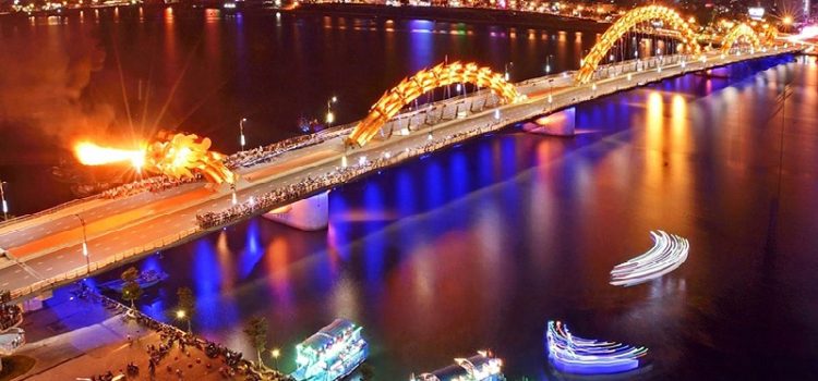 Cũng vào dịp cuối tuần, bạn có thể đến xem cầu Rồng phun lửa vào lúc 21h tối thứ 7 và chủ nhật, sau đó tham quan khu chợ đêm Sơn Trà ở chân cầu Rồng và sau đó đi xem cầu quay sông Hàn.